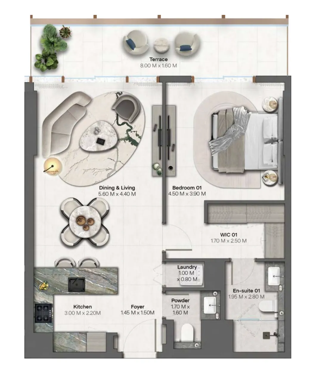 Les logements proposent une sélection d’appartements aux volumes bien équilibrés, complétés par des typologies plus exclusives, destinées à une clientèle recherchant des surfaces généreuses et une expérience résidentielle aboutie. Chaque agencement privilégie la fluidité, la simplicité et le confort, avec une séparation naturelle entre les espaces de vie et les zones plus intimes.
