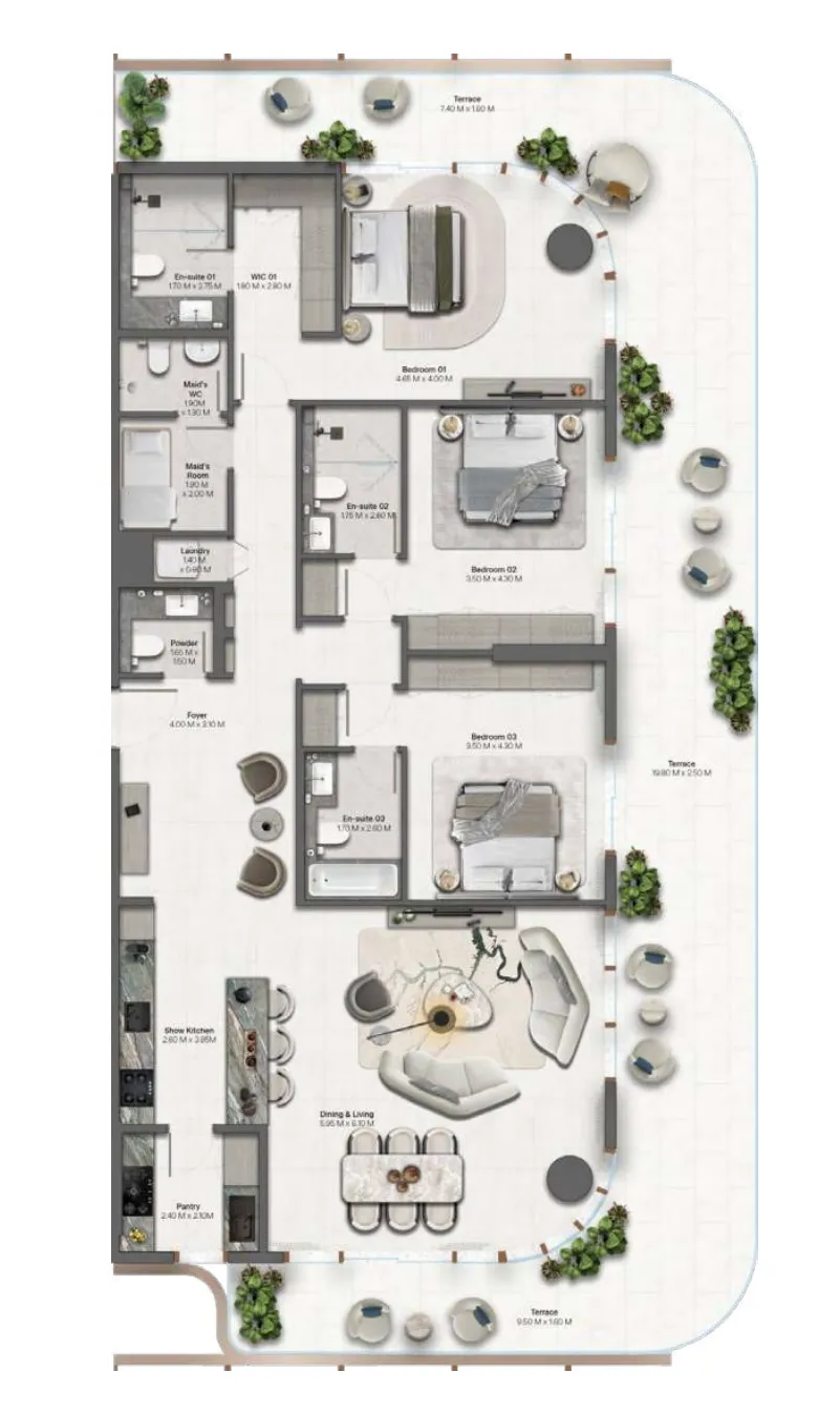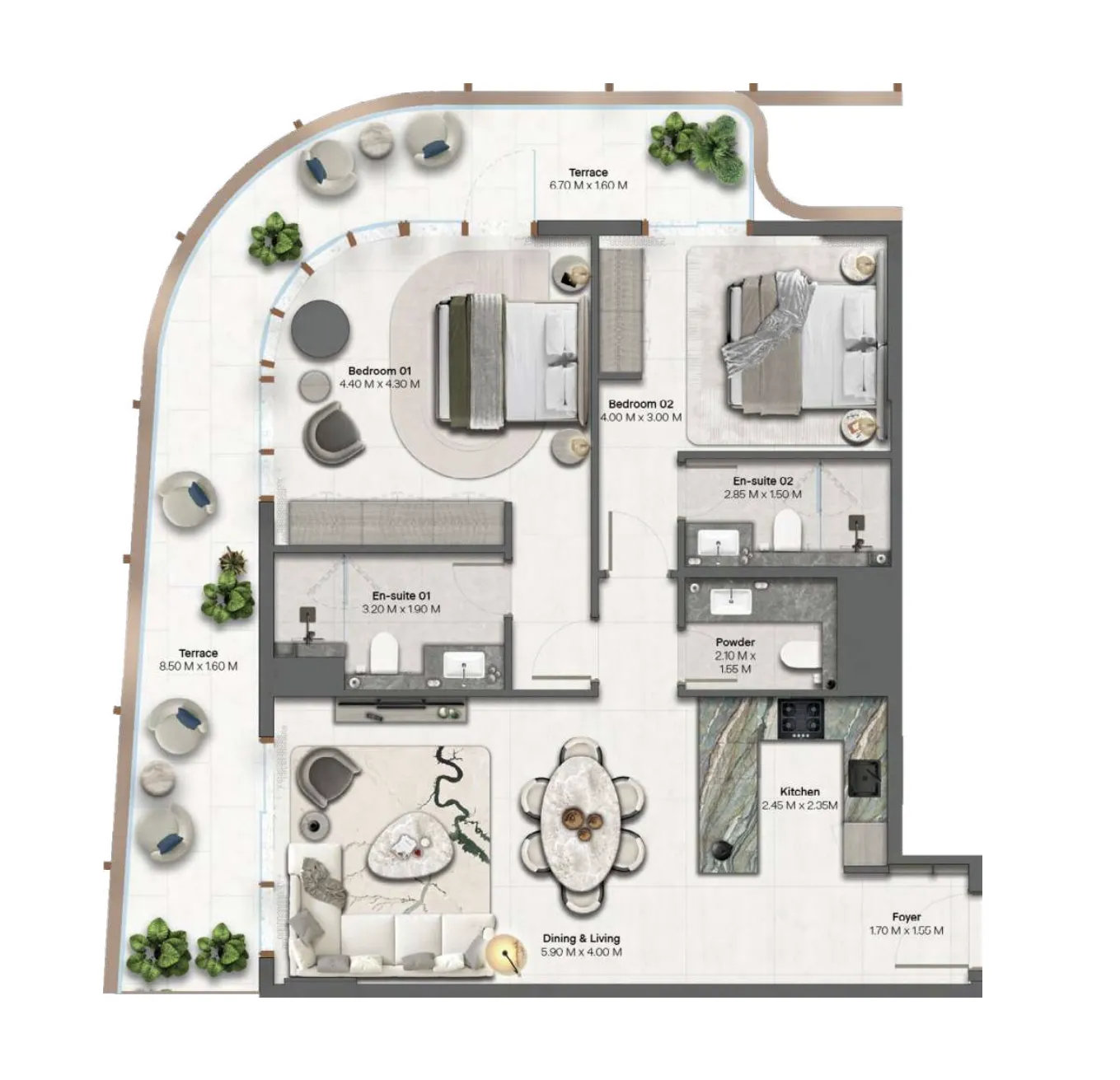 Les tours reposent sur une base paysagère commune, ponctuée de jardins, de patios et de bassins de réflexion, qui viennent ancrer le projet dans une atmosphère calme et organique. Cette conception favorise une circulation naturelle entre les espaces, tout en créant une transition fluide entre intérieur et extérieur. L’ensemble reflète une vision résidentielle contemporaine, où l’architecture accompagne le rythme de vie, sans l’imposer.