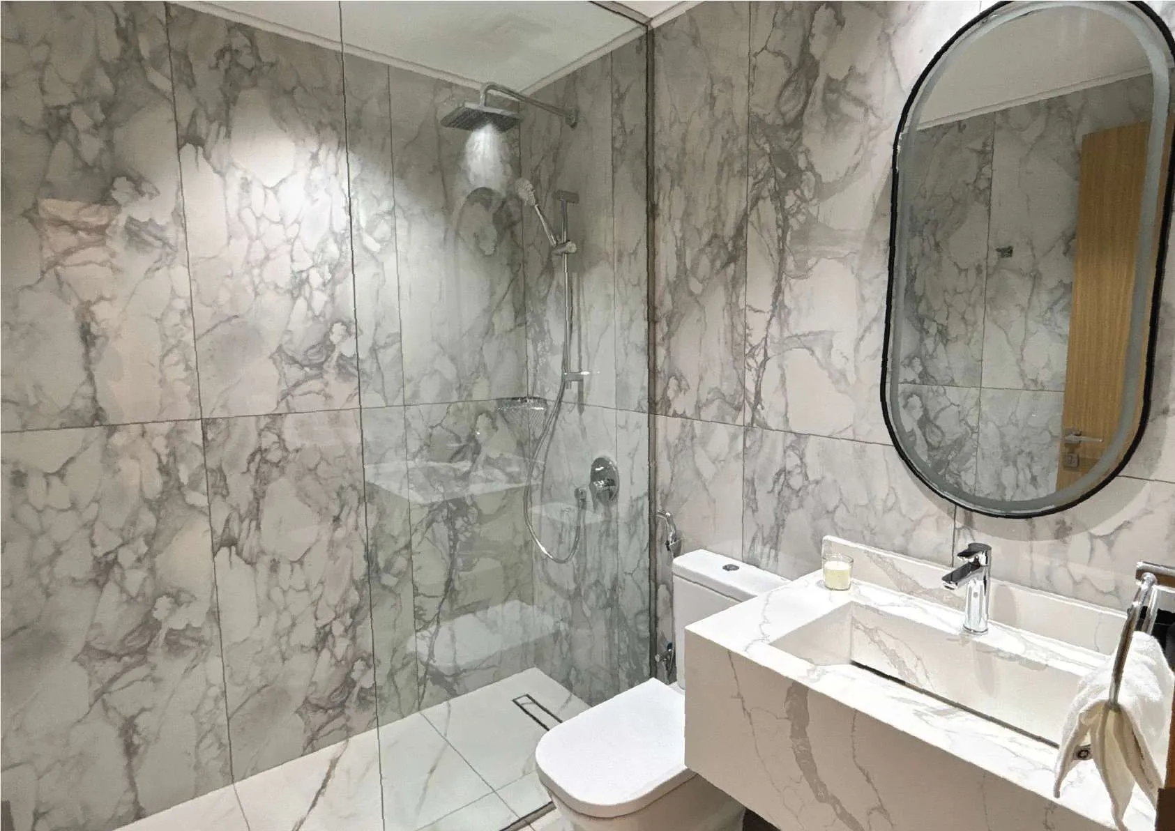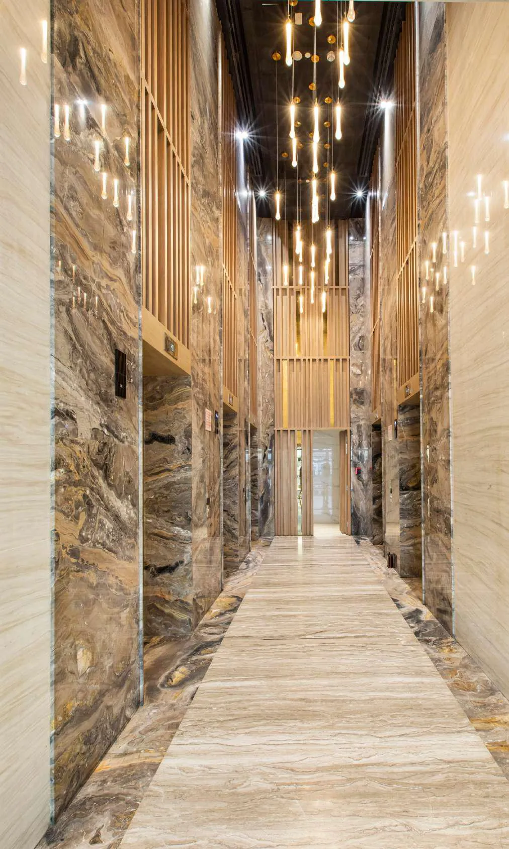 Dès l’arrivée, AA Tower impose un univers sophistiqué. Le lobby, habillé de marbres aux veinages puissants et de finitions haut de gamme, donne le ton d’une résidence pensée pour impressionner. L’accueil est soigné, spacieux, lumineux et reflète la volonté d’AMA Developer de proposer une expérience résidentielle haut de gamme.