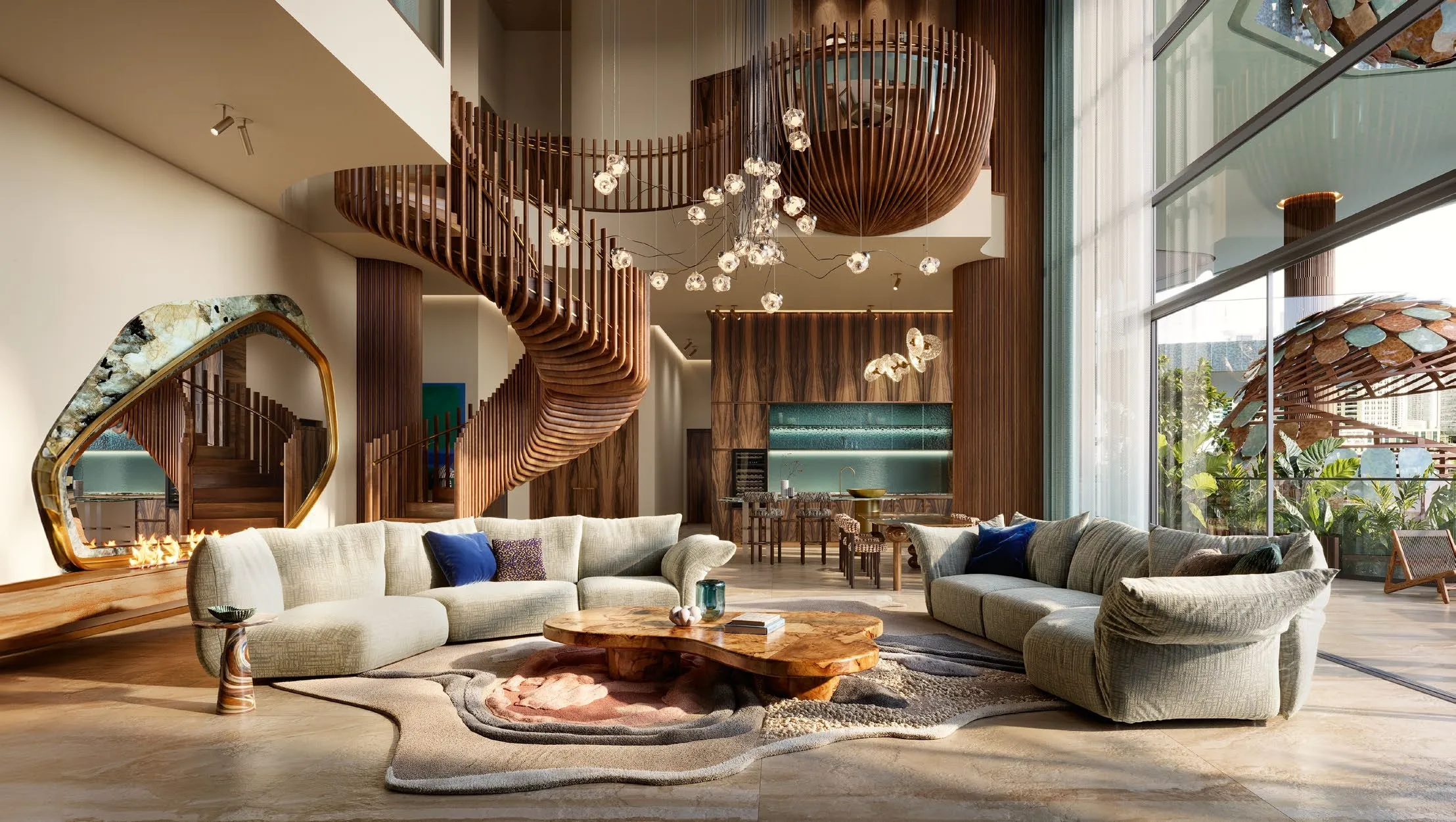 Eywa propose des appartements de 2 à 4 chambres, des duplex de 3 à 5 chambres et un penthouse spectaculaire. Chaque résidence bénéficie d’un ascenseur privé qui mène directement à un lobby dédié, permettant un niveau de confidentialité rarement offert à Dubaï.