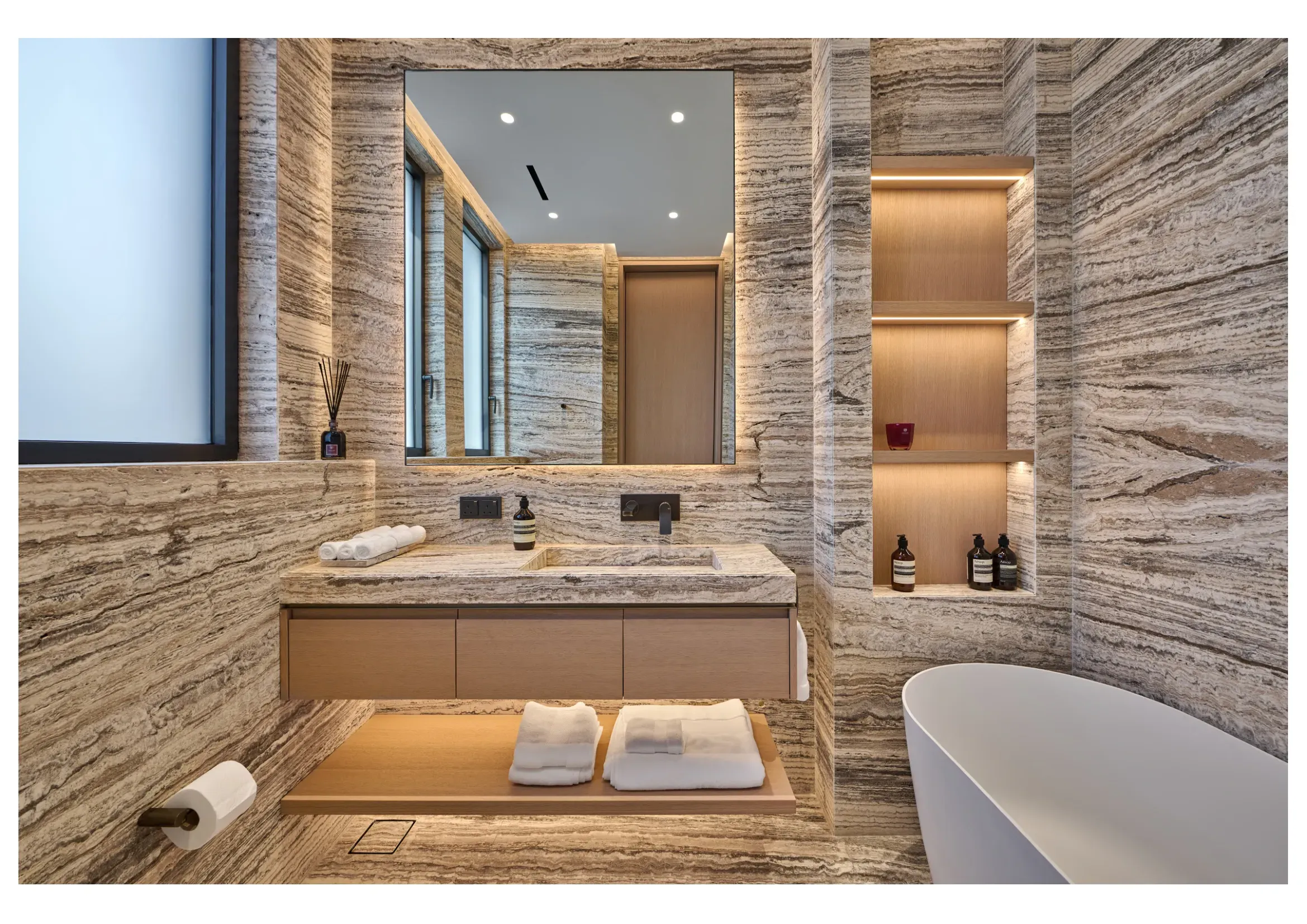 Les murs et sols sont habillés de matières naturelles d’exception : quartzite Patagonia, marbre, travertin… Ce mélange crée une palette minérale sophistiquée, parfaitement mise en valeur par les volumes généreux et la lumière naturelle omniprésente.