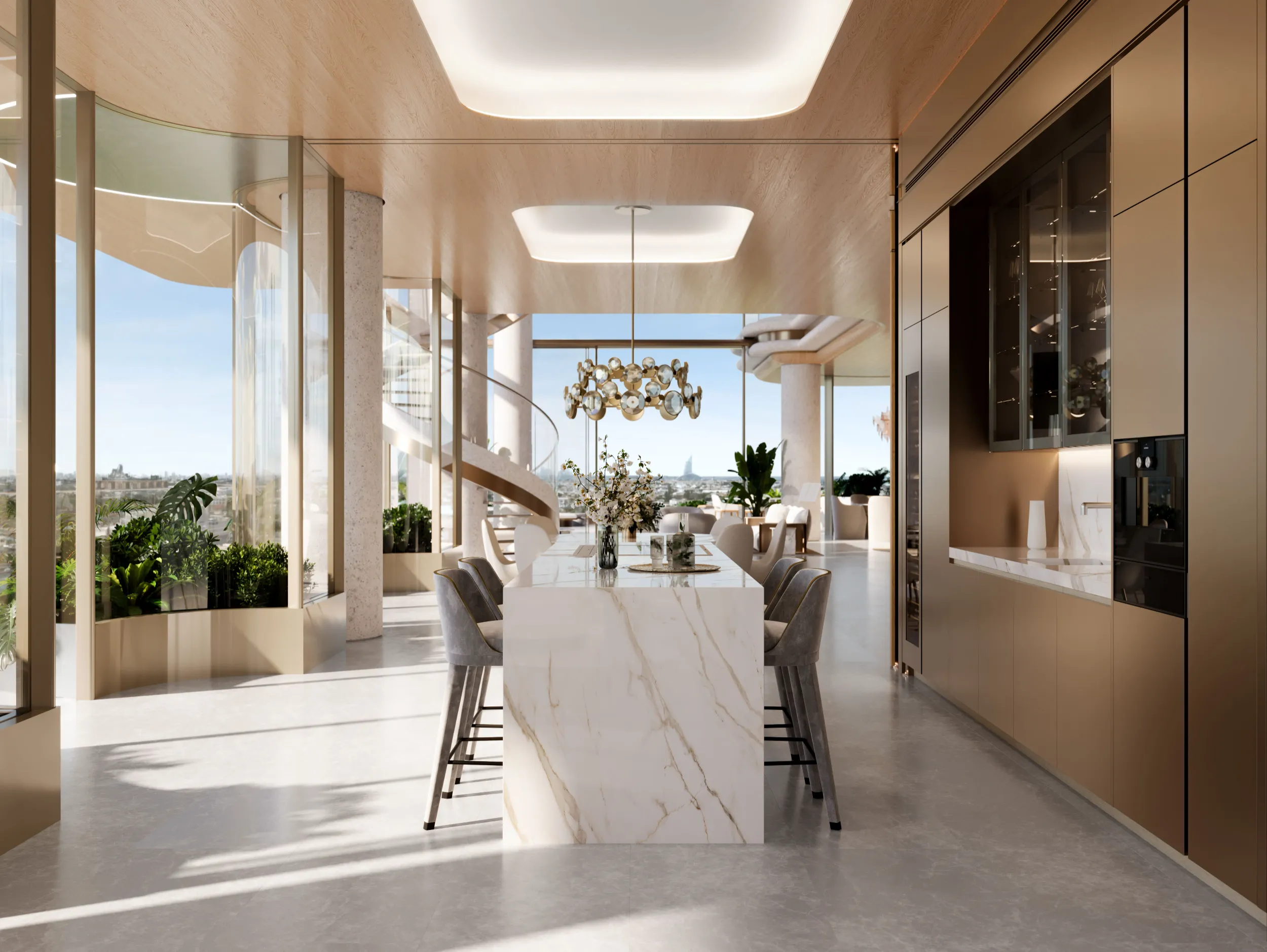 À l’intérieur, The Rings pousse les standards du luxe à leur plus haut niveau. Les finitions sont réalisées à partir de matériaux nobles et exclusifs, soigneusement sélectionnés pour leur qualité et leur durabilité. Marbres, bois précieux, pierres naturelles et éléments sur mesure composent des intérieurs élégants, intemporels et résolument haut de gamme.